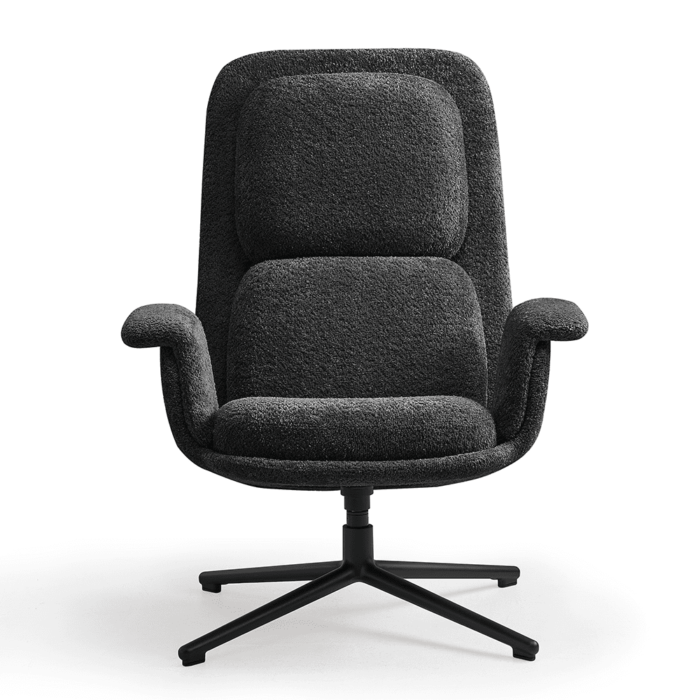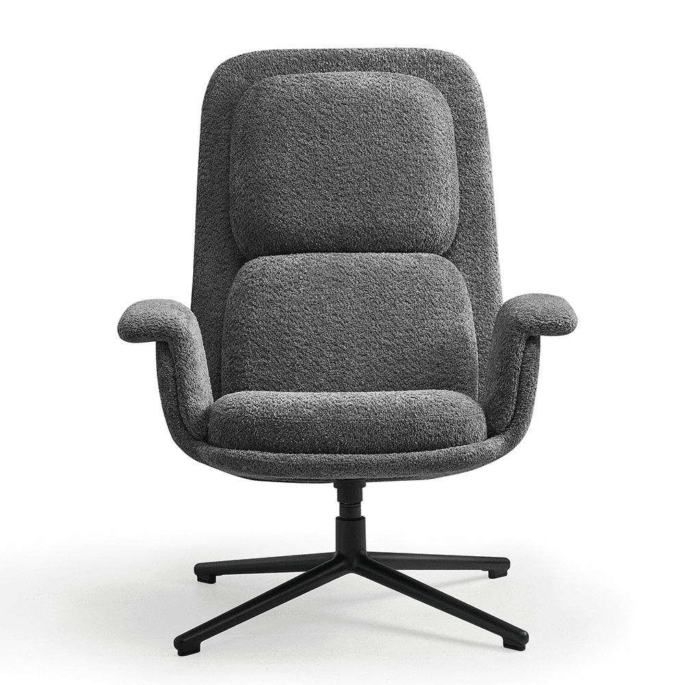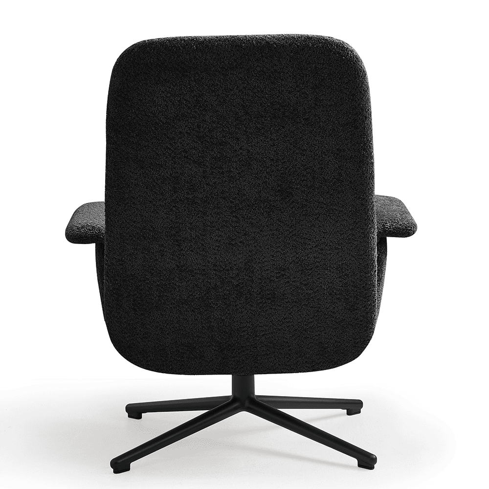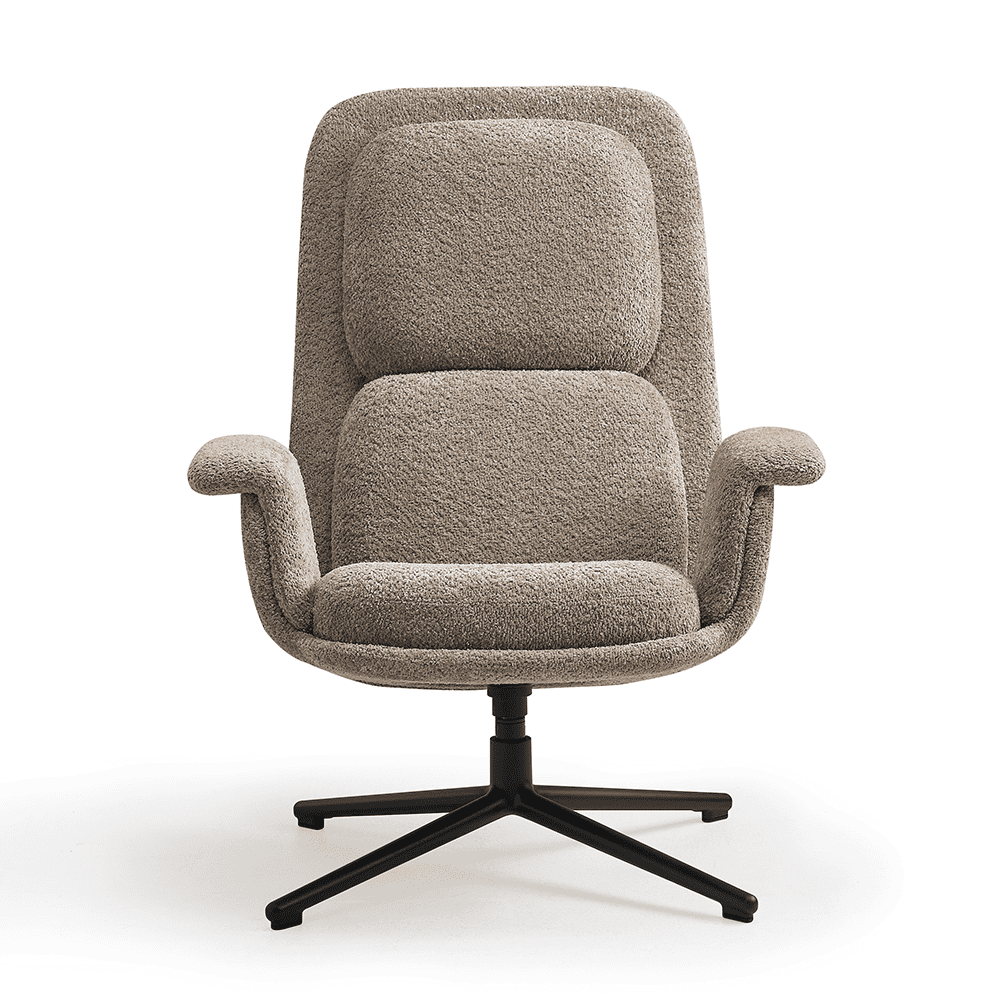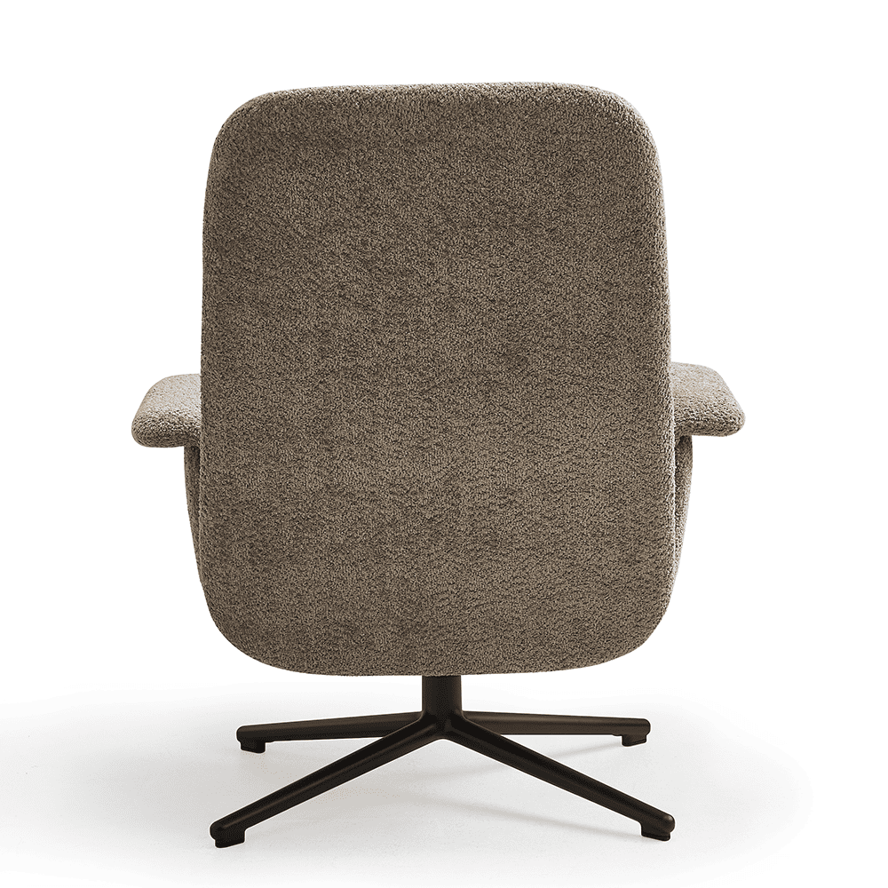 De stoel is uitgerust met comfortabele armleggers, een 360° draaifunctie en is bekleed met zachte teddy-stoffering die warm en luxueus aanvoelt. De zwartgelakte vierpoots stervoet geeft de fauteuil een moderne en elegante uitstraling.