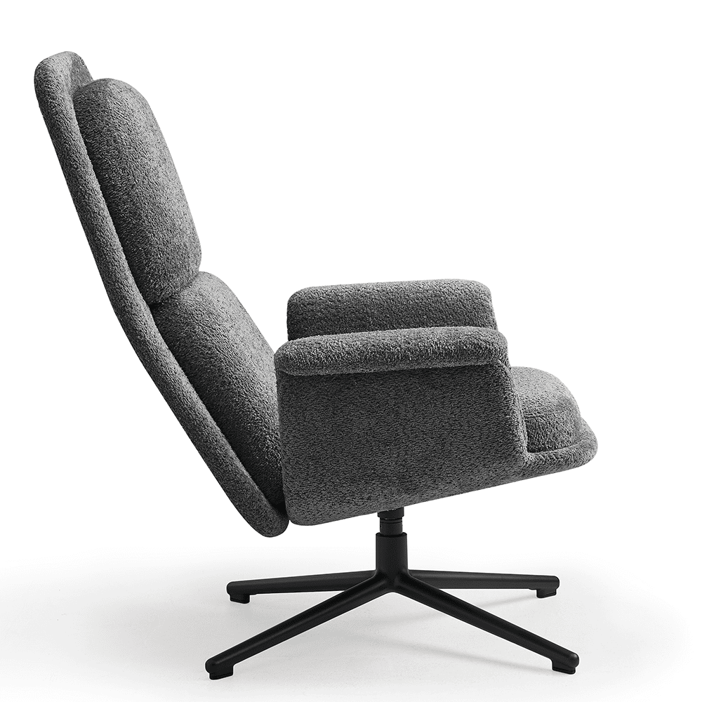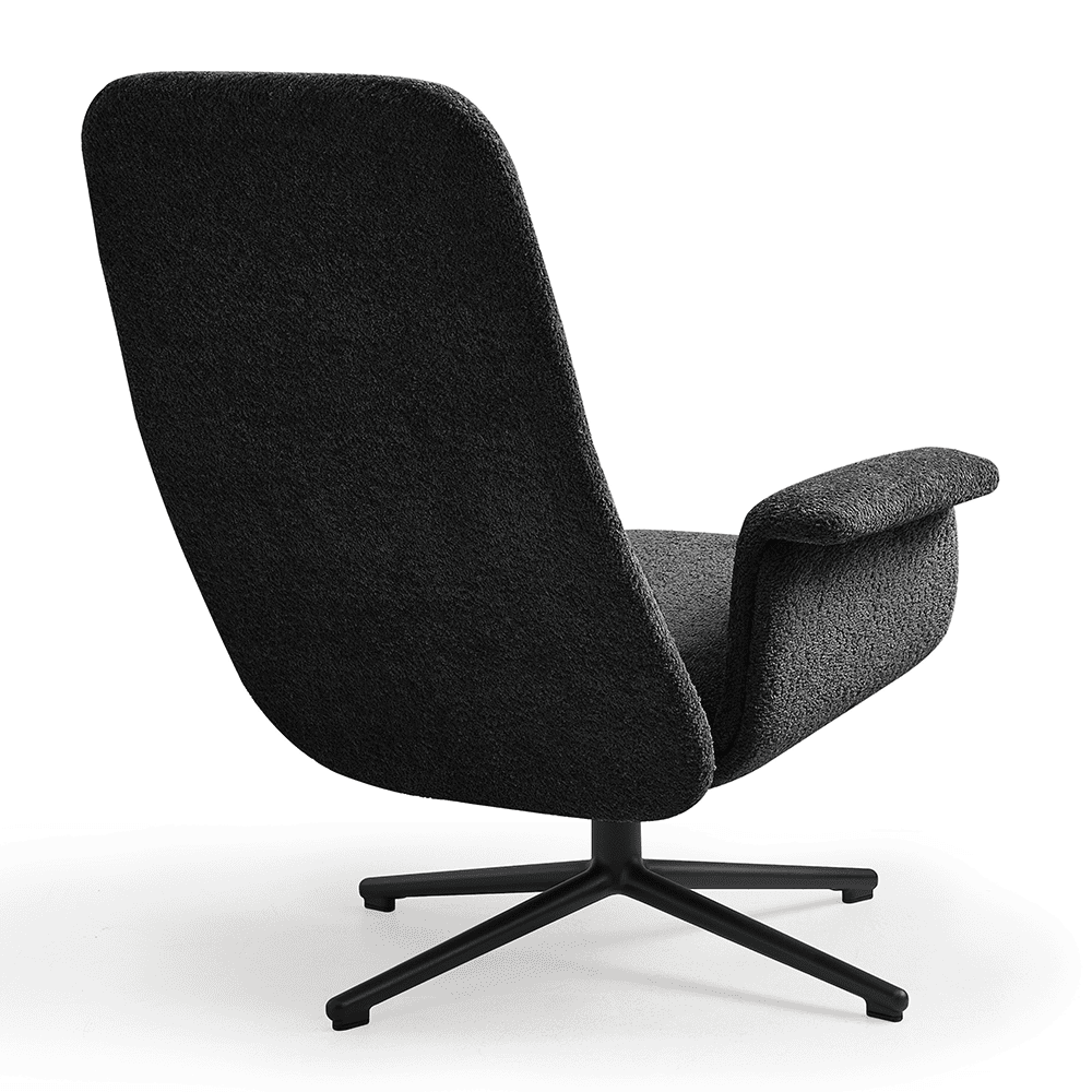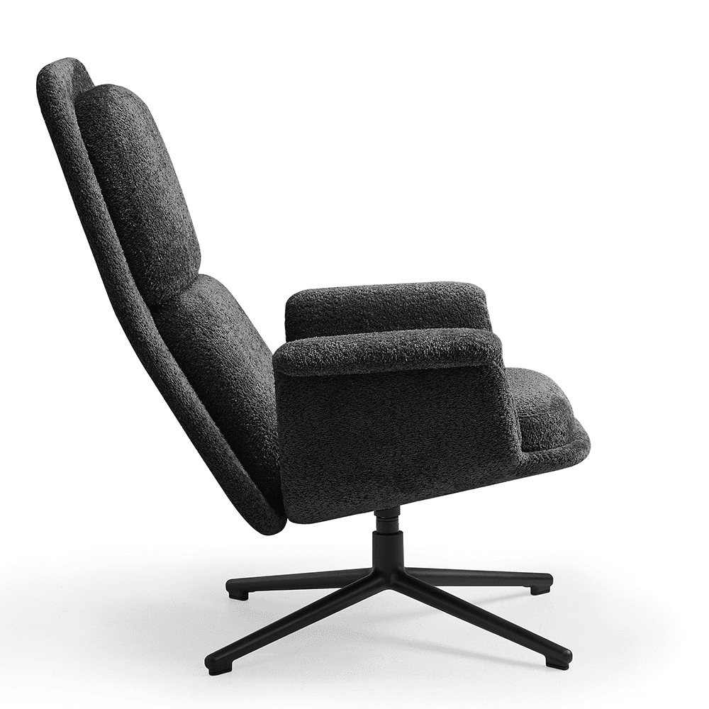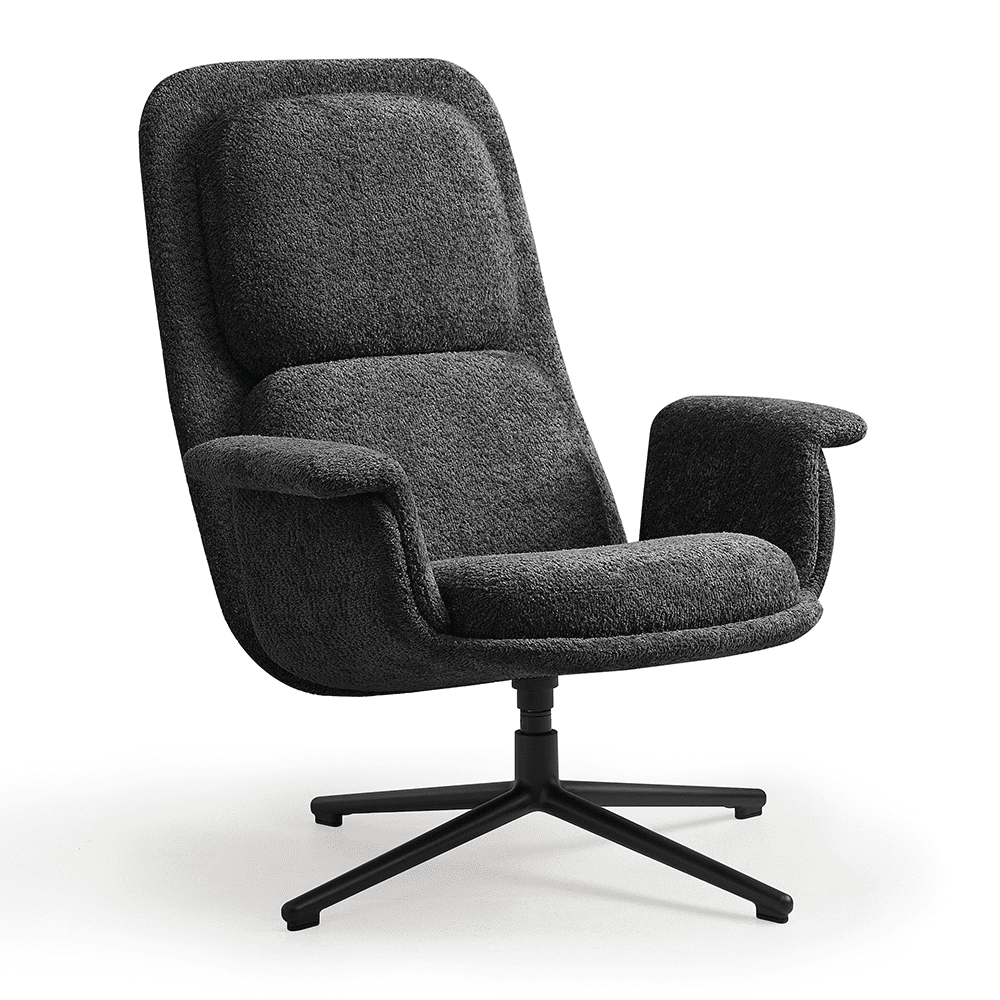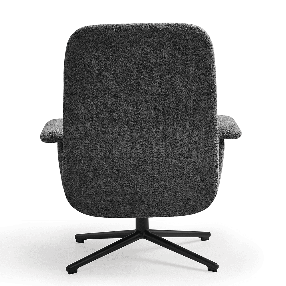 De stoel is uitgerust met comfortabele armleggers, een 360° draaifunctie en is bekleed met zachte teddy-stoffering die warm en luxueus aanvoelt. De zwartgelakte vierpoots stervoet geeft de fauteuil een moderne en elegante uitstraling.